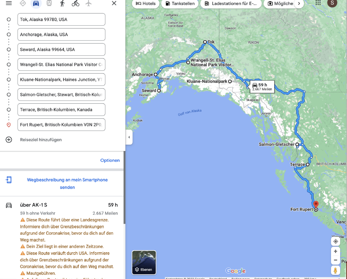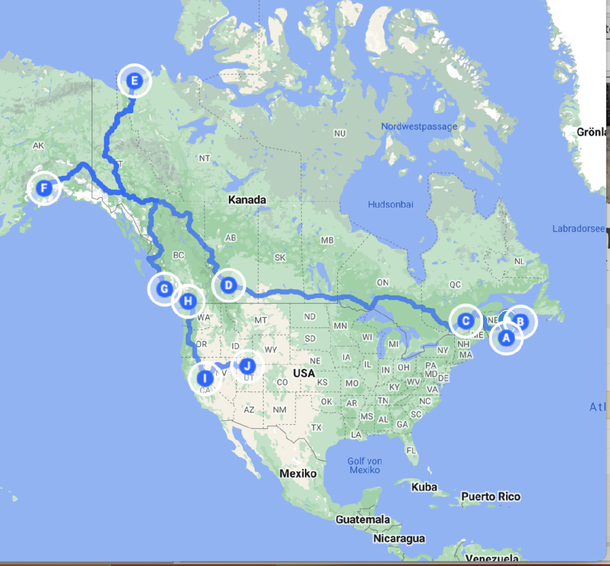 Wir fliegen nach Toronto und dann nach Halifax, wo unsere Allradmobil Emma am Hafen ankommen wird. Mit Emma starten wir Anfang April über das Cape Breton, Quebec, Montreal, vorbei an den großen Seen nach Thunderbay und Winnepeg zu den Rockies. Den Mai möchten wir in den Nationalparks um Banff und Jasper verbringen. Je nach Wetterlage und Strassenbeschaffenheit geht es dann weiter über den Dempster Highway zum Artic Ocean und dann über den Highway "Top of the World" nach Anchorage. Wir planen die Fährfahrt "Inside Passage" im Juli, die uns nach Vancouver Island bringen wird. Voraussichtlich im August werden wir Oregon erkunden.